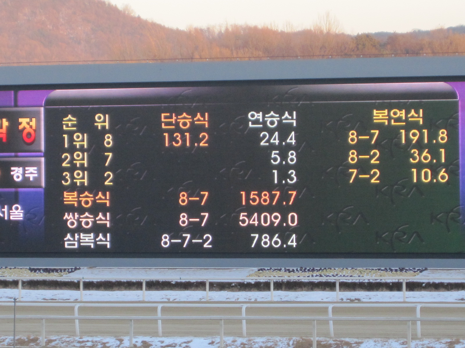130/1 shot Burning Sky and Hwang Soon Do led 50/1 Sky Center and Kim Hae Sun across the line to land one of the most unlikely results Seoul Race Park has seen in recent times. The quinella paid 1587.7 while the exacta yielded returns of 5409.0. With 943,233,500 Won (about $850,000) in the exacta pool, someone evidently had a good Sunday evening.