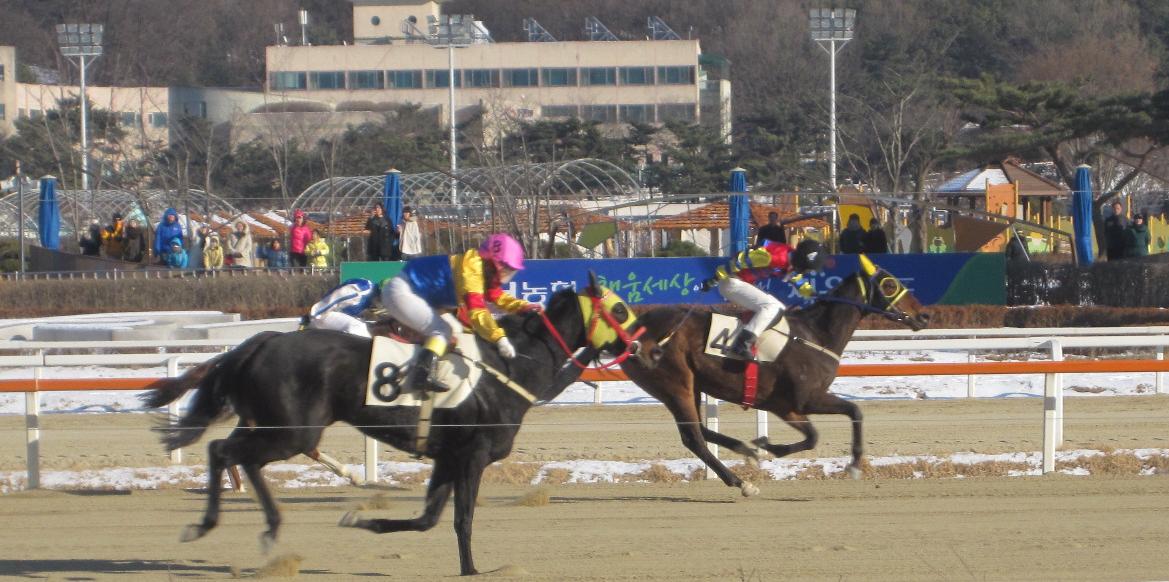 The key characteristic of Seoul today was that it was cold. Very cold. The warmest it got all day was four degrees below zero while six below was the average. By comparison it was positively t-shirt and shorts weather down at Busan where they manages a princely three degrees above for their six-race card which included co-features. In the first of them, Japanese jockey Yoshi Aoki got his first big race win of the year as he partnered last year’s Derby third Triple Sinhwa to a smart win. Although he picked up a ban in the process, Aoki will still look on it as a good day’s work. In the finale, favourite Nuri Choegang [Awesome Of Course – Jamie Love (Roy)] flashed past Kiwi’s Playboy in the final furlong to take a surprisingly comfortable victory.