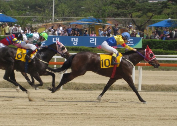 Down at Busan, Korea’s current number one horse Mister Park (Ecton Park) further enhanced his reputation as he moved onto fourteen straight wins by taking the feature race. Facing exclusively foreign-bred opposition for the first time and with a relatively unknown jockey on board, punters still sent the 2010 Grand Prix winner off as the long odds-on favourite. And, despite one or two nervous moments, he didn’t let them down. Bounding out of the gate into an early lead, Lee Dae Yeon and Mister Park had the race fully under control from the beginning and looked set for a comfortable win.